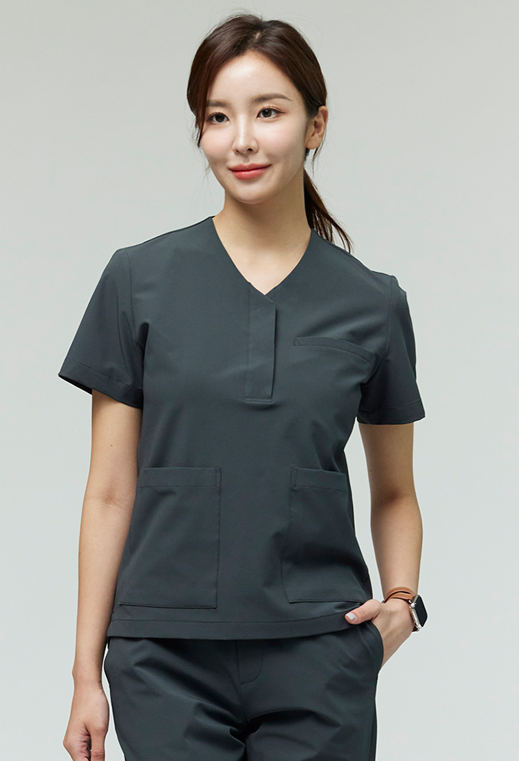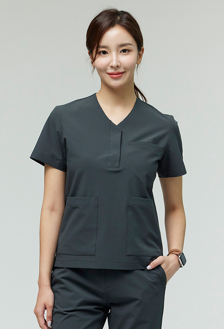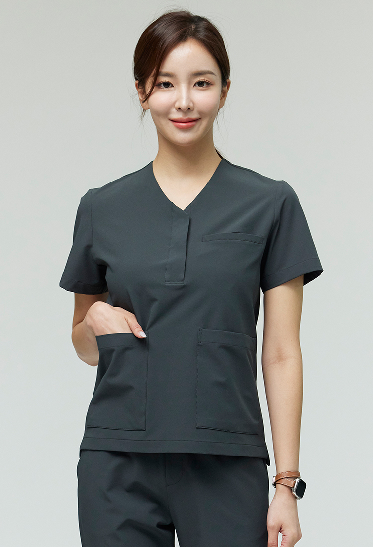클래식한 디자인의 V넥 스크럽복으로, 편안한 착용감을 제공합니다. 가슴 안쪽에는 무독성 친환경 인증을 받은 선그립 스냅을 적용해 손쉽게 여닫을 수 있도록 설계되었습니다. (일부제품은 기존 알러지케어 스냅이 장착되어 있습니다.)