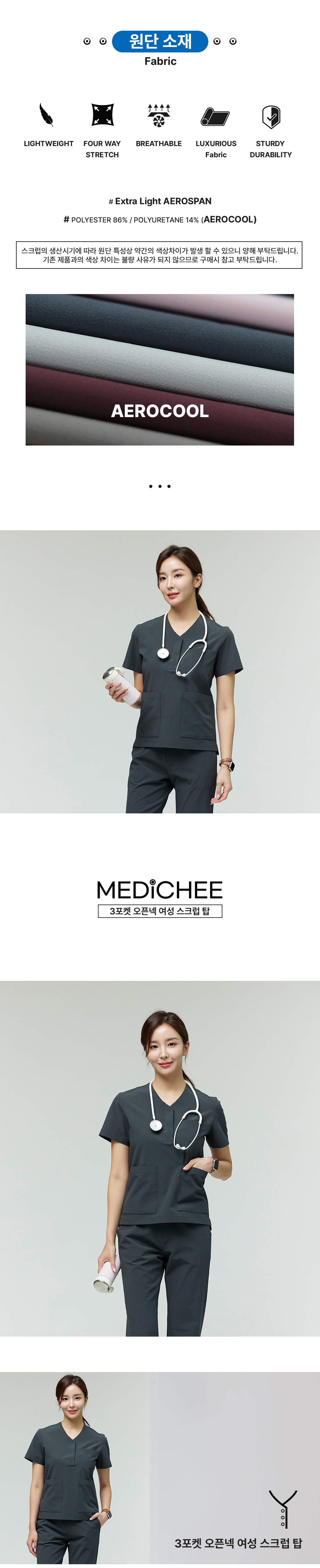 기본 사이즈 스크럽복으로, 오랜 연구 끝에 의료 환경에 최적화된 원단을 사용하여 제작되었습니다. 원단은 MEDICHEE Extra Light AEROSPAN 기능성 원단을 적용했으며, 86% Polyester + 14% Polyurethane 구성으로 우수한 신축성을 자랑해 장시간 착용해도 부담이 없습니다.
