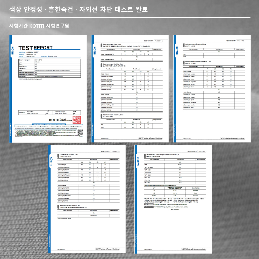 * KOTITI 시험연구원 색상 안정성, 흡한속건, 자외선 차단 테스트 완료