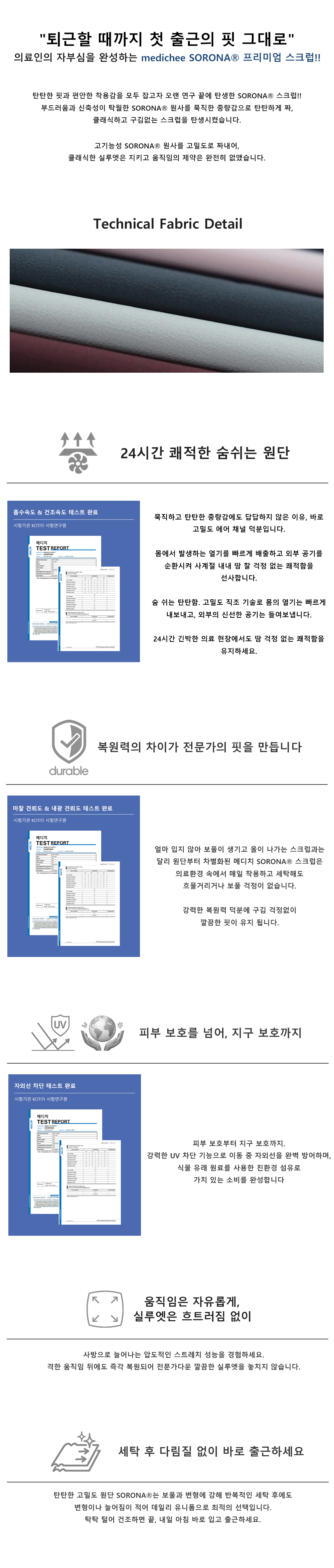 기본 사이즈 스크럽복으로, 오랜 연구 끝에 의료 환경에 최적화된 원단을 사용하여 제작되었습니다. 원단은 MEDICHEE SORONA® 스크럽은 61% Polyester + 39% SORONA® 구성으로 신축성이 우수하며, 구김이 적고 형태 안정성이 좋습니다.