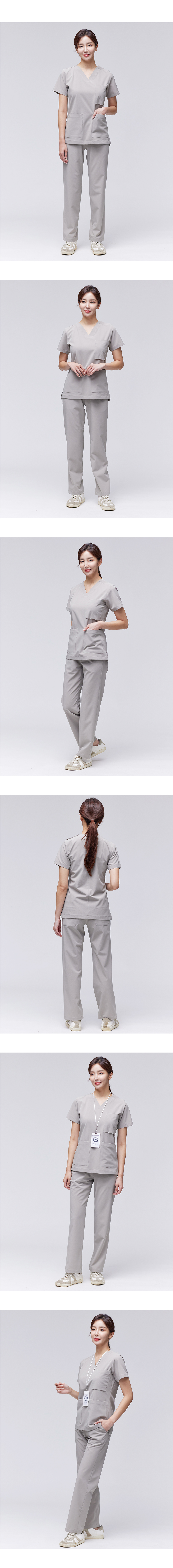 클래식한 V넥 디자인의 스크럽복 제품으로 착장이 편안하도록 어깨라인 안쪽에 무독성 친환경 인증을 받은 선그립 스냅을 사용 하였습니다. 또한, 실용성을 고려한 전면 포켓 2개와 가슴 포켓 1개를 배치해 의료용품 및 소지품을 보다 편리하게 보관할 수 있습니다.