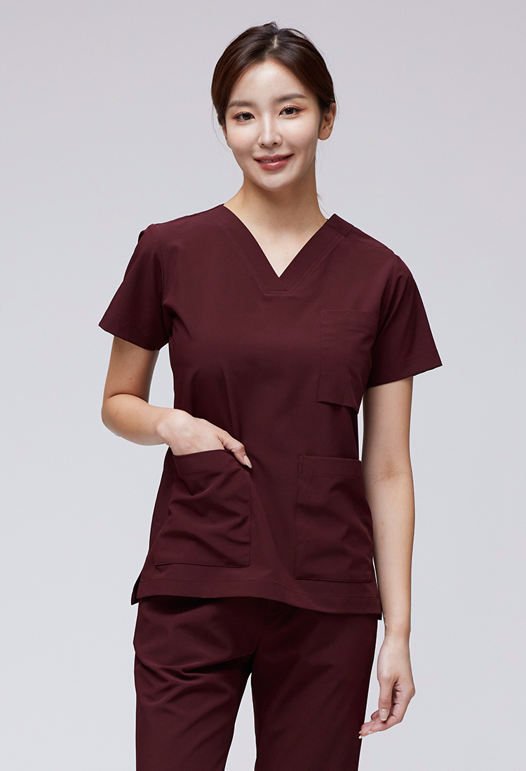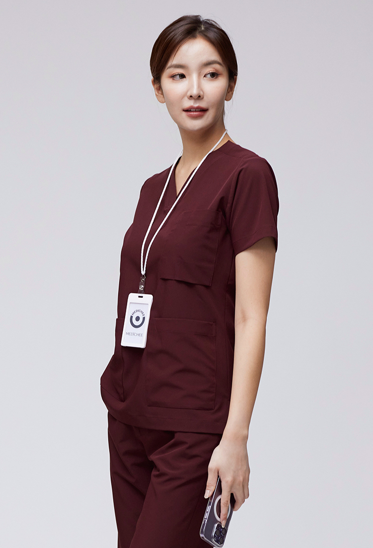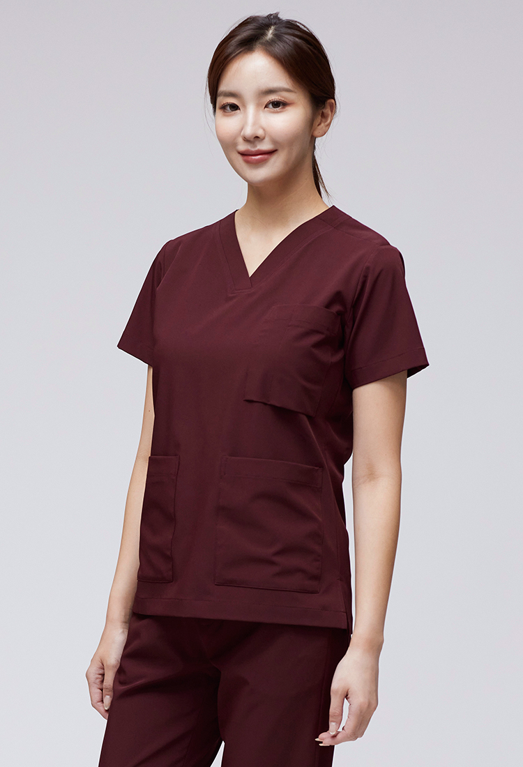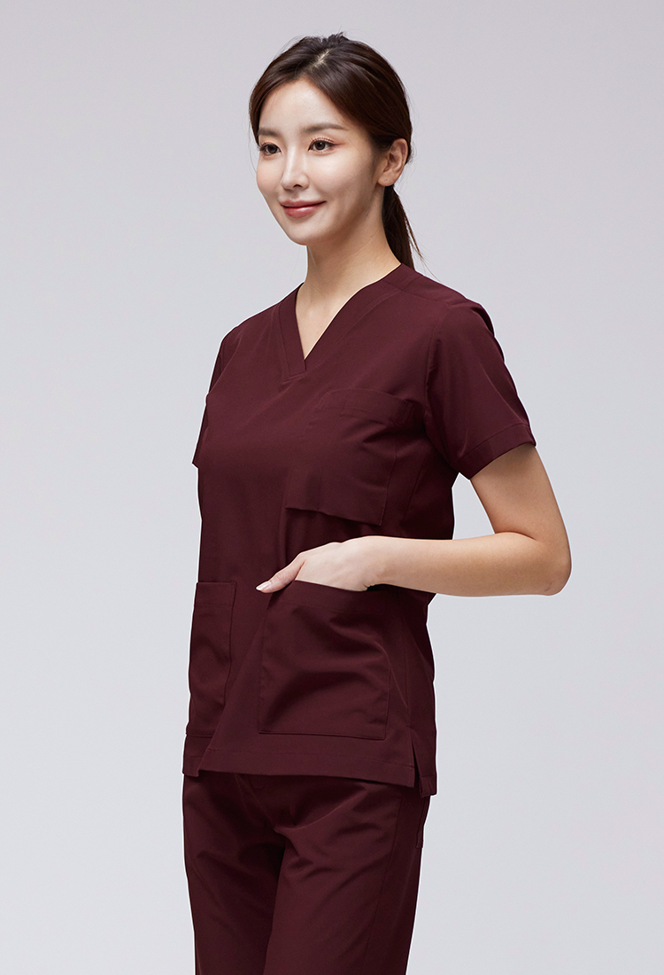클래식한 V넥 디자인의 스크럽복 제품으로 착장이 편안하도록 어깨라인 안쪽에 무독성 친환경 인증을 받은 선그립 스냅을 사용 하였습니다. 또한, 실용성을 고려한 전면 포켓 2개와 가슴 포켓 1개를 배치해 의료용품 및 소지품을 보다 편리하게 보관할 수 있습니다.