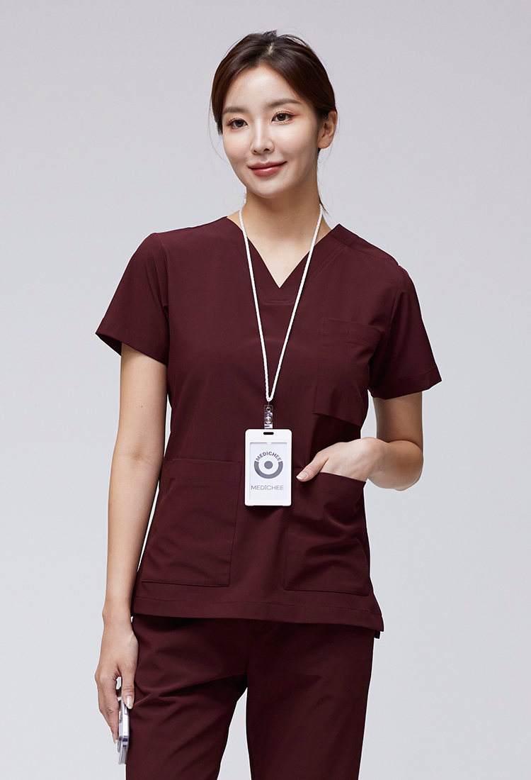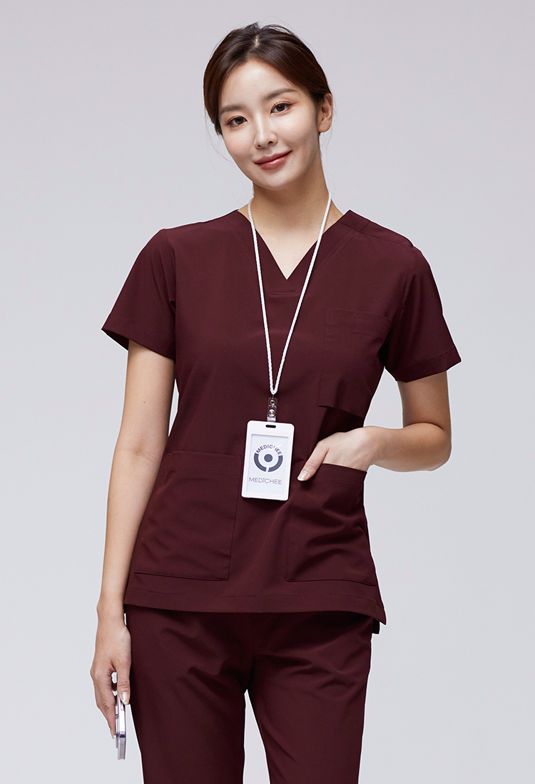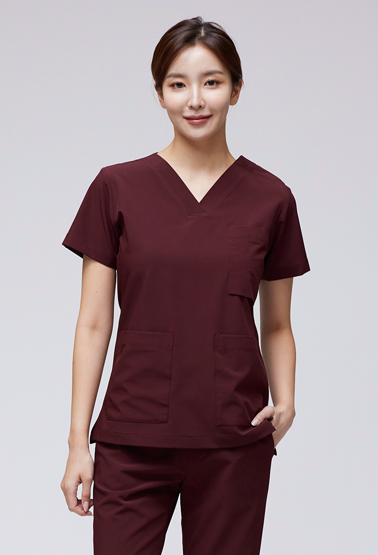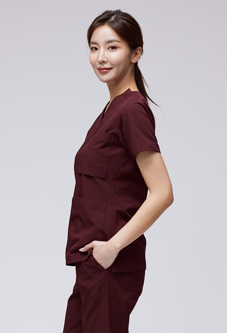 클래식한 V넥 디자인의 스크럽복 제품으로 착장이 편안하도록 어깨라인 안쪽에 무독성 친환경 인증을 받은 선그립 스냅을 사용 하였습니다. 또한, 실용성을 고려한 전면 포켓 2개와 가슴 포켓 1개를 배치해 의료용품 및 소지품을 보다 편리하게 보관할 수 있습니다.