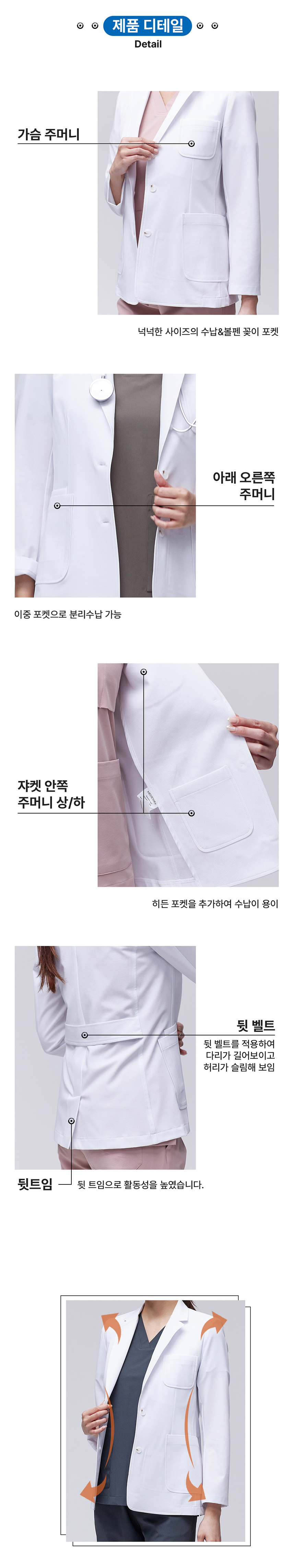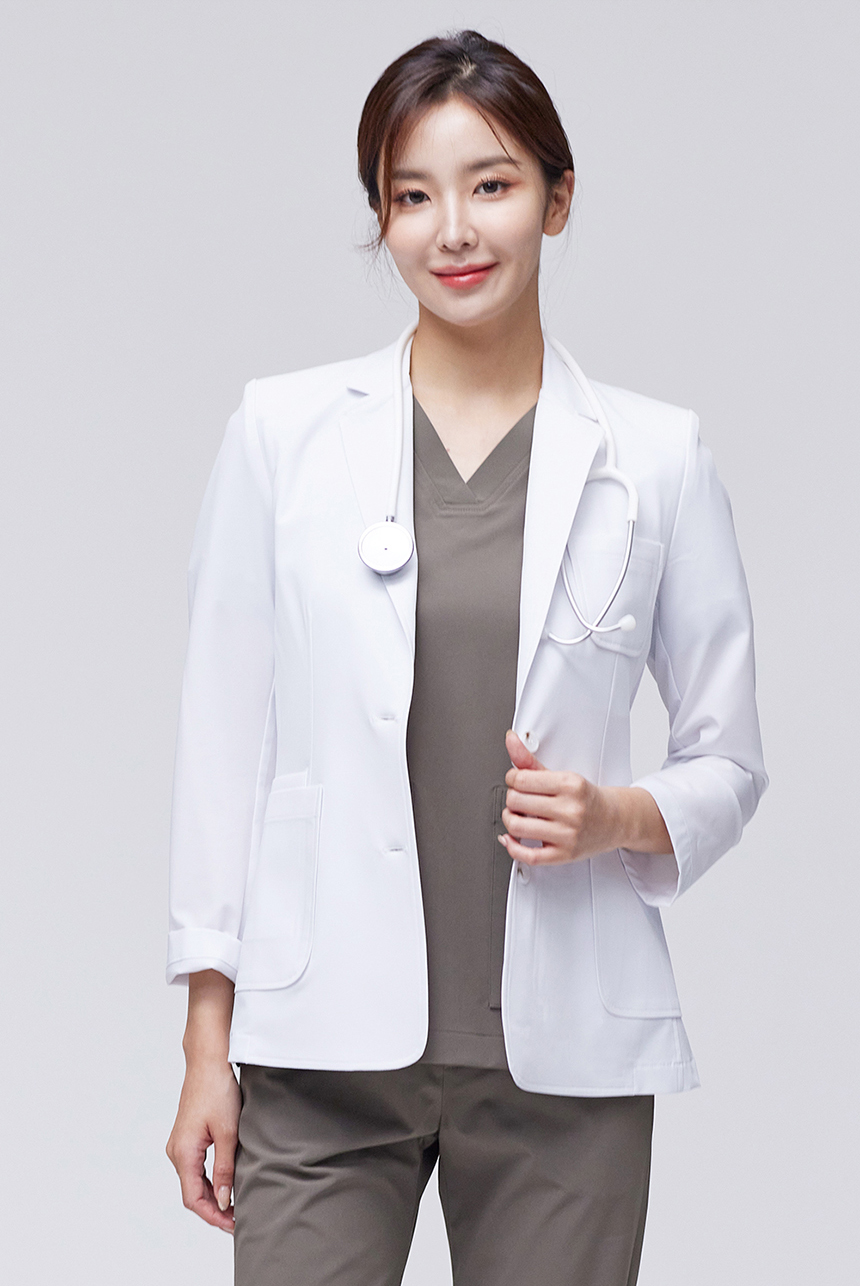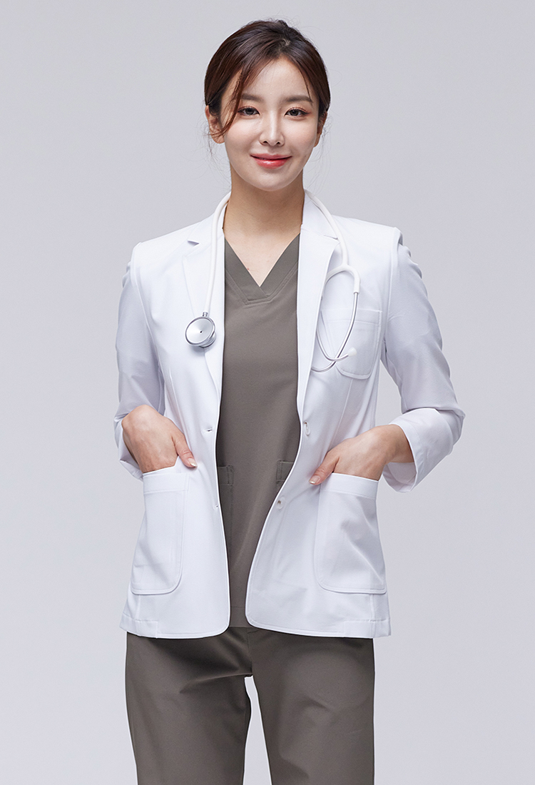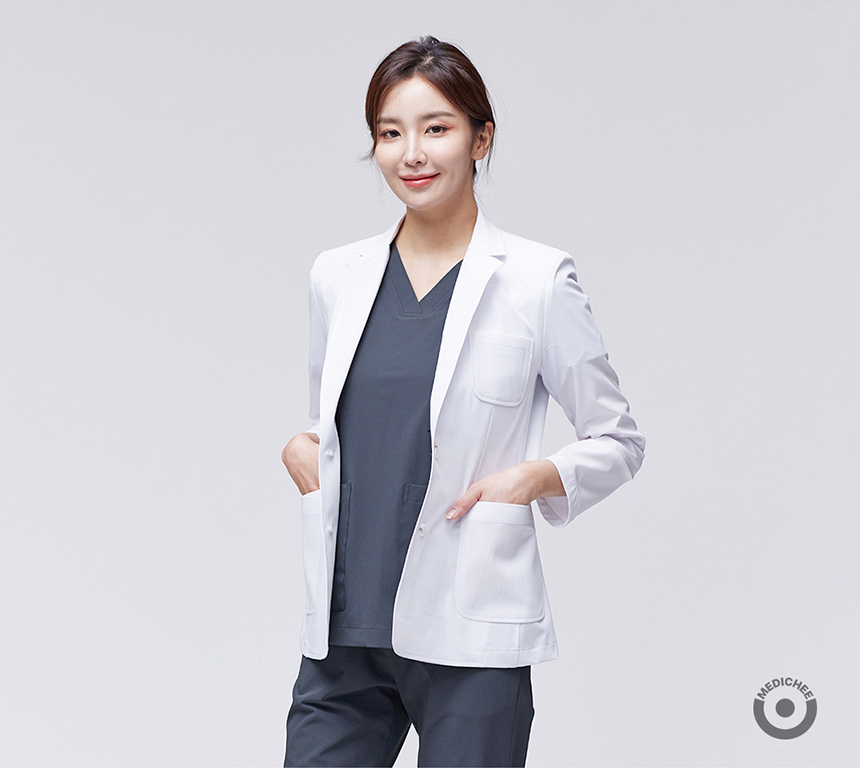 medichee 프리미엄 의사가운 쟈켓 원단은 기존 병원유니폼 업체에서 많이 사용하던 좌/우 스트레치 원단이 아닌 4way(상/하/좌/우 360도) 스트레치가 가능한 Extra Light AEROSPAN 고신축 기능성 원단을 사용해 활동성을 높였습니다.