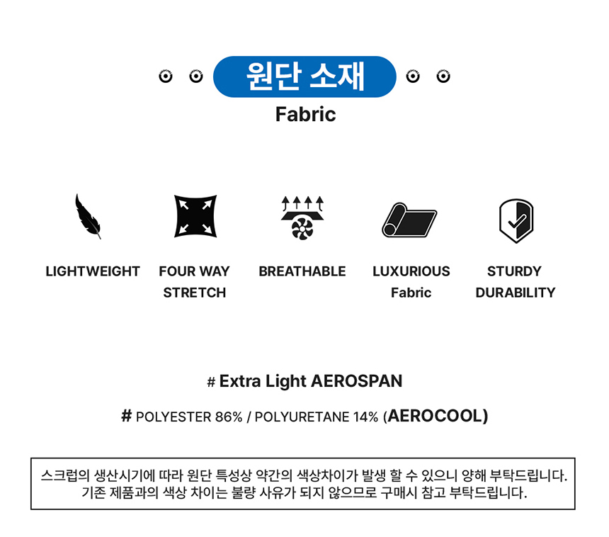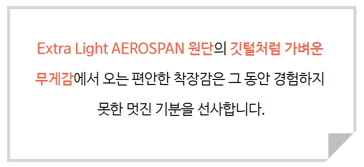 Extra Light AEROSPAN 원단은 최대한 활동성은 높이고 원단의 형태 유지성 및 복원력이 뛰어나며 어떠한 활동에도 무리가 없도록 사방스판(4way스판) 어느 방향으로 늘어나도 문제가 없도록 설계되었습니다.