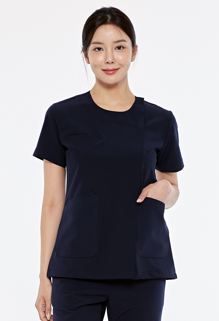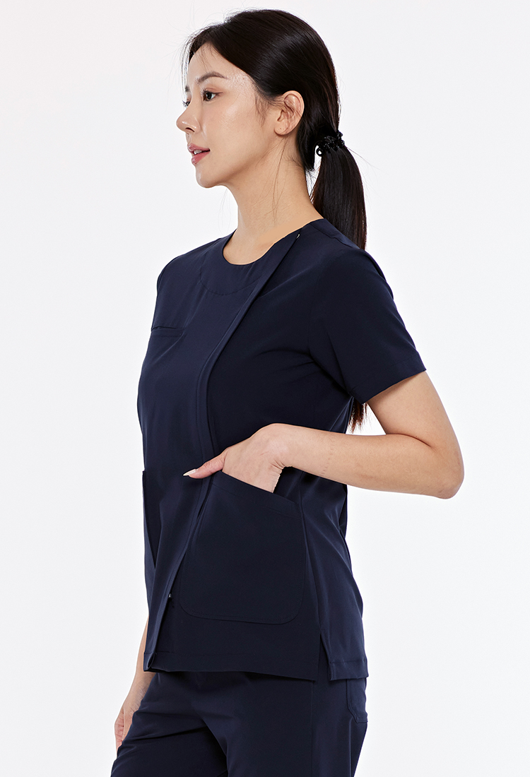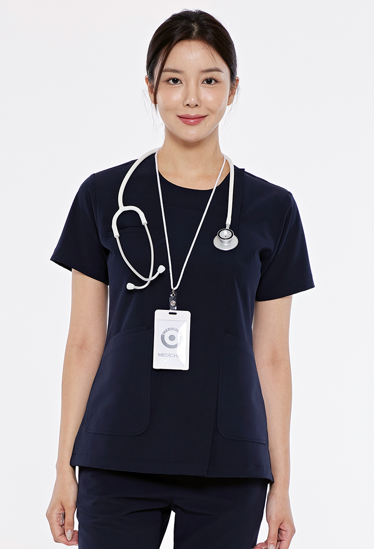 클래식한 디자인의 라운드넥 집업 스크럽복 제품으로 착장이 편하도록 앞쪽에 지퍼가 있으며 지퍼 끝 안쪽에 무독성 친환경 인증을 받은 선그립 스냅을 사용 하였습니다. 또한, 실용성을 고려한 전면 포켓 2개와 가슴 포켓 1개를 배치하였고, 하단 포켓중 오른쪽은 이중포켓으로 의료용품 및 소지품을 보다 편리하게 보관할 수 있습니다.