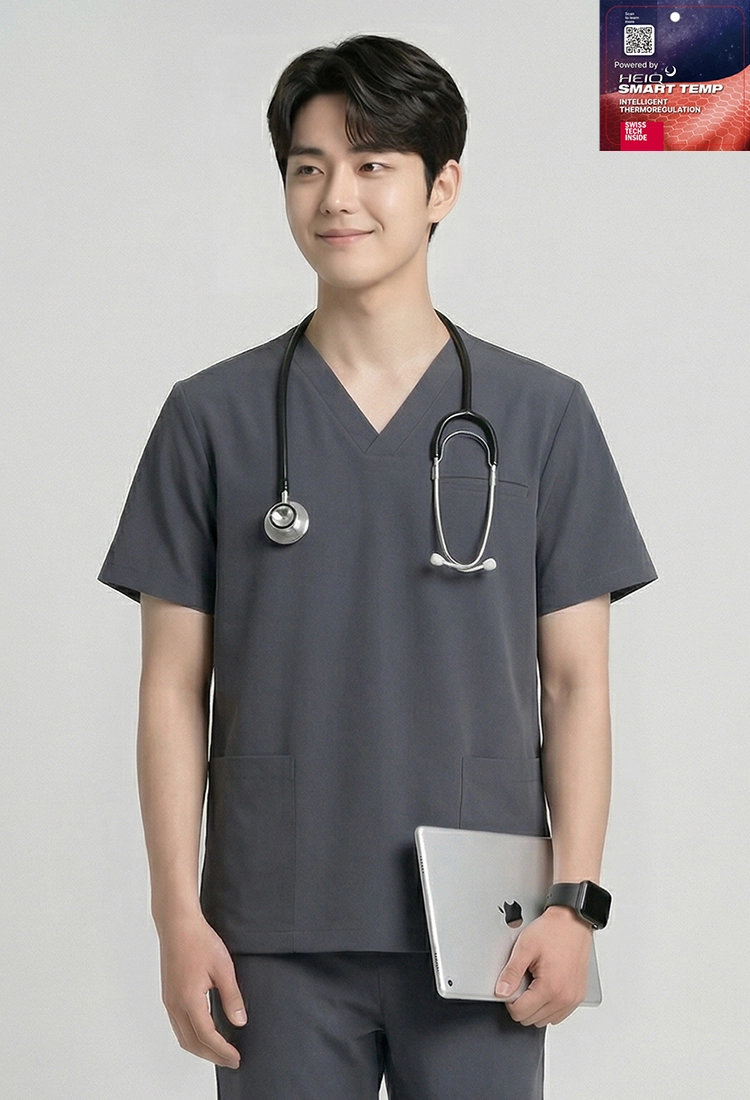 오랜 기간 연구 개발하여 의료 환경에 최적화된 메디치 원단에, 스위스 혁신 기술 기업 HEIQ(하이큐)사의 HEIQ Pure & Smart Temp 기능성을 적용하였습니다. 또한, 86% Polyester + 14% Polyurethane 구성으로 우수한 신축성을 자랑하여 장시간 착용해도 편안합니다.