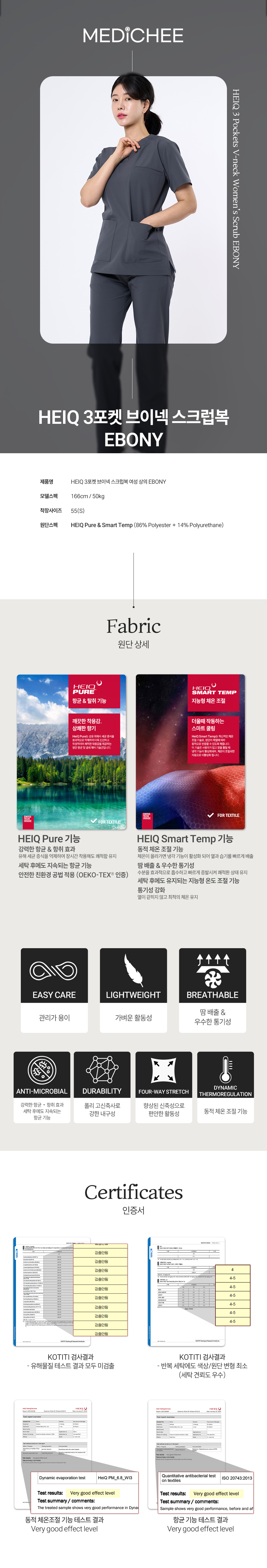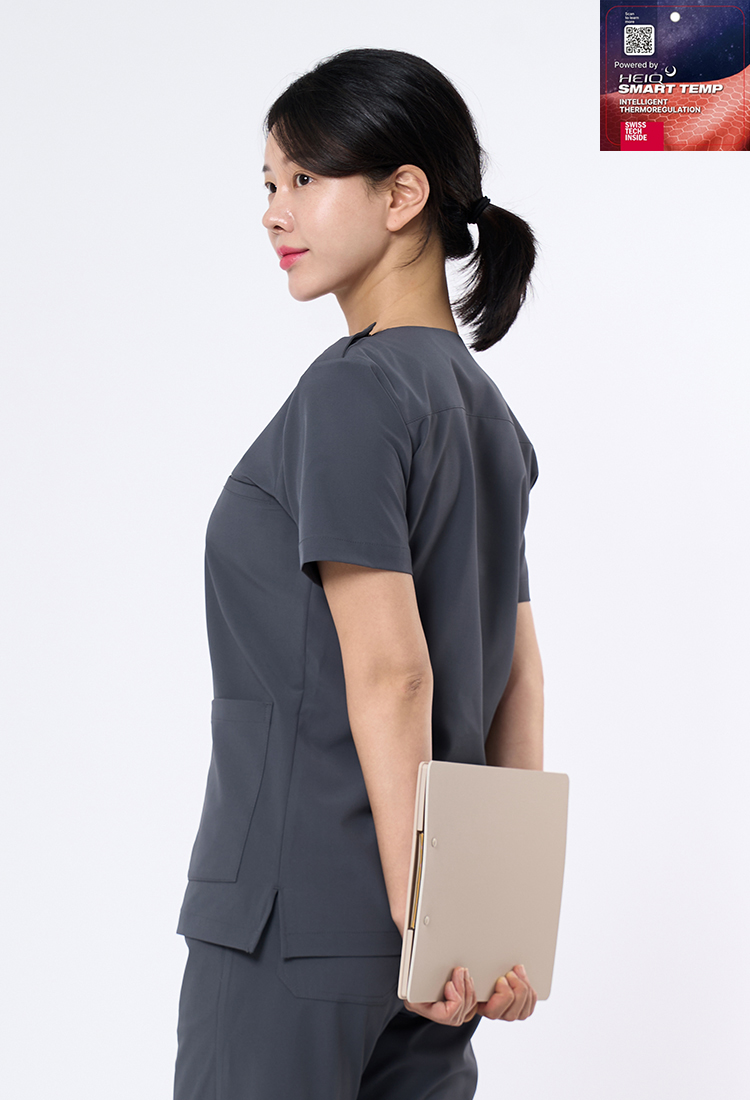 오랜 기간 연구 개발하여 의료 환경에 최적화된 메디치 원단에, 스위스 혁신 기술 기업 HEIQ(하이큐)사의 HEIQ Pure & Smart Temp 기능성을 적용하였습니다. 또한, 86% Polyester + 14% Polyurethane 구성으로 우수한 신축성을 자랑하여 장시간 착용해도 편안합니다.